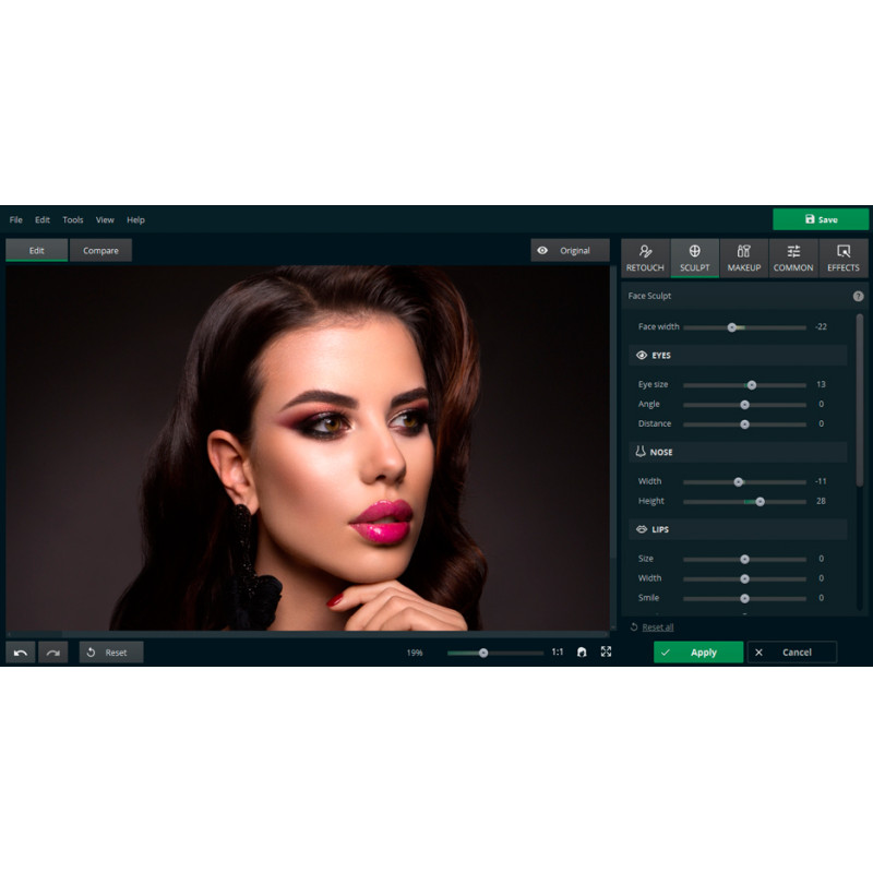 PhotoDiva позволит избавиться от морщин, бликов и покраснений. Программа выровняет тон кожи, придаст загар и подчеркнет скулы. За несколько кликов вы сможете устранить эффект красных глаз и темные круги, изменить цвет радужки и сделать взгляд на снимке более выразительным. Дополнительно можно поработать над ухмылкой. Делайте губы тоньше или объемнее, меняйте их цвет на любой другой и отбеливайте зубы. Создайте идеальный портрет просто!