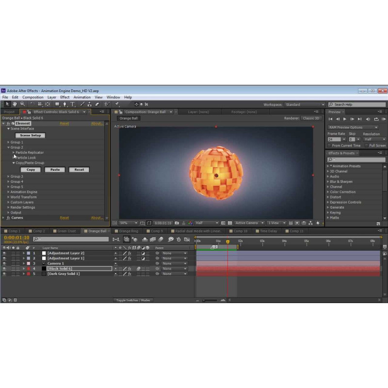 Анімація об'єктів виконується за допомогою стандартних інструментів After Effects, включаючи ключові кадри, камери та освітлення. Можливе налаштування анімації окремих частин моделі або всієї сцени.